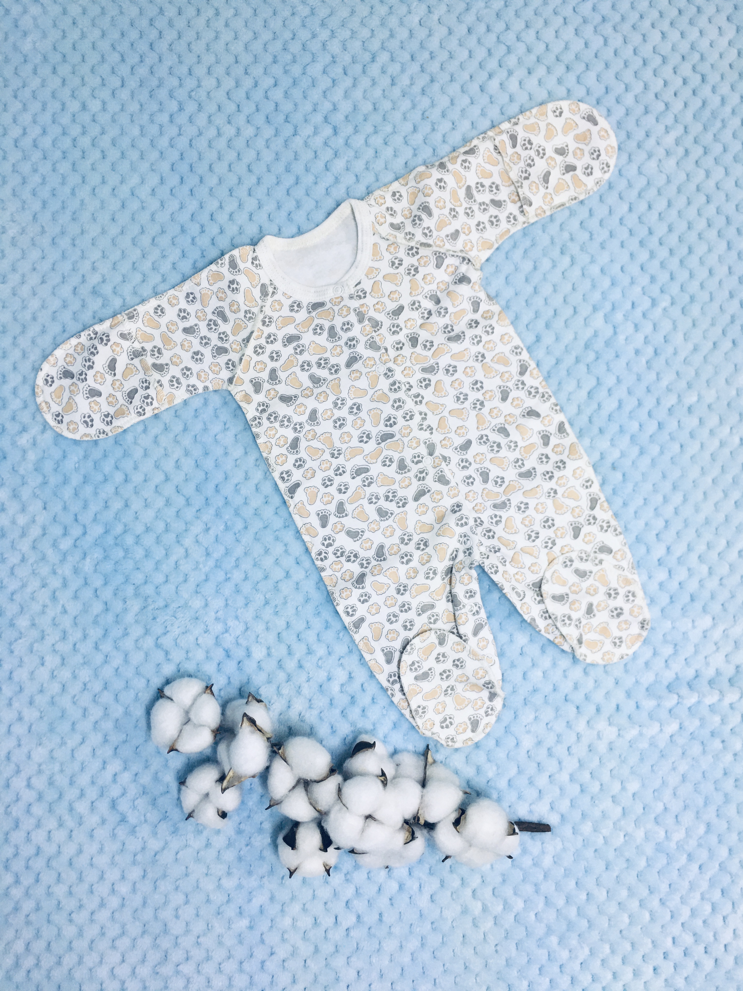 Комбинезон выполнен из 100% хлопка (футер с начёсом). Комбинезон с закрытыми ножками, без воротничка, рукавчики-трансформеры. Комбинезон спереди и между ножек на кнопочках. Швы выполнены наружу.